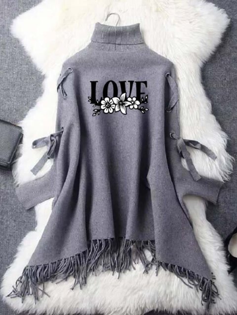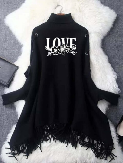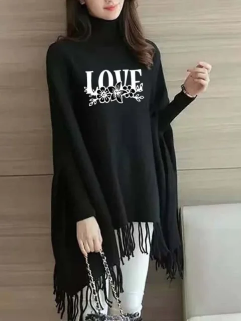 Zayra Black-White Love Printed Bat-Wing Style Winter Poncho